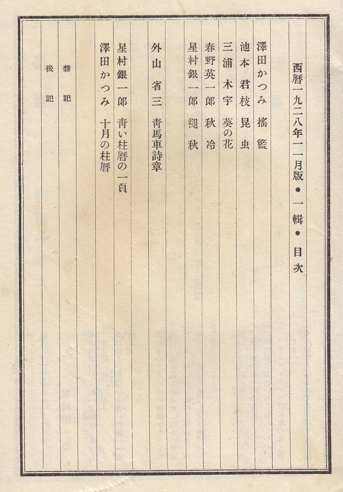 昭和3年11月1日 青い柱暦社発行 定価10銭 菊判 12頁 発行所住所:大阪府佐野町大将軍町八一四 星村方