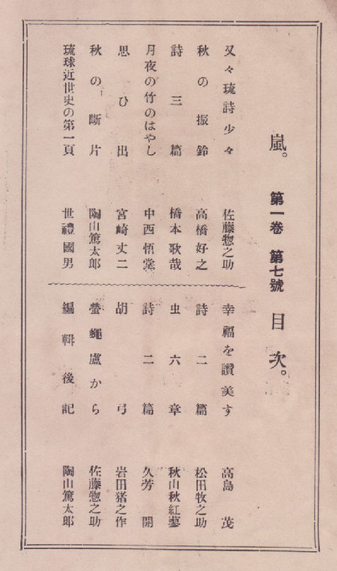 大正11年11月15日 嵐社発行 定価30銭 菊判 24頁 編輯兼発行人:佐藤惣之助