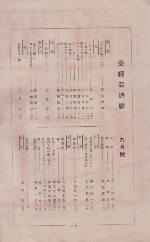 第二巻第七號昭和2年9月1日 亞細亞詩脈協會発行(京城) 定価20銭 菊判 32頁 編輯兼発行人:内野健兒 装幀:恩地孝四郎
