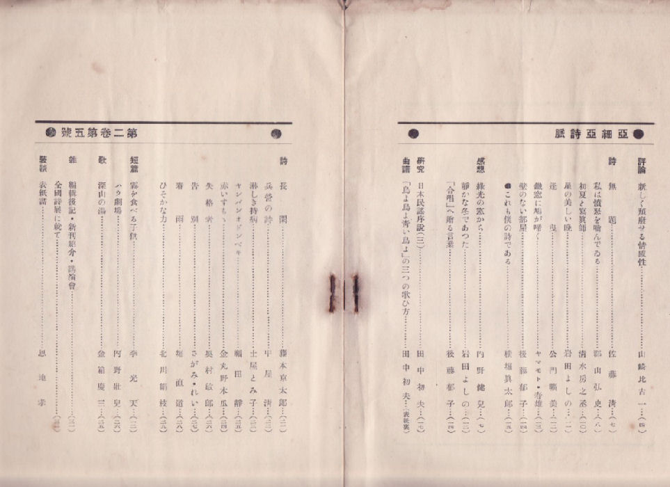 第二巻第五號昭和2年6月1日 亞細亞詩脈協會発行(京城) 定価20銭 菊判 32頁 編輯兼発行人:内野健兒 装幀:恩地孝四郎