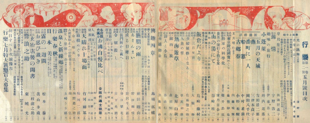 大正14年5月1日 行樂社発行 定価50銭 菊判 240頁 編輯人:石川宰三郎 発行人:海老原藤一 表紙:淺野薫 口繪:木谷千種