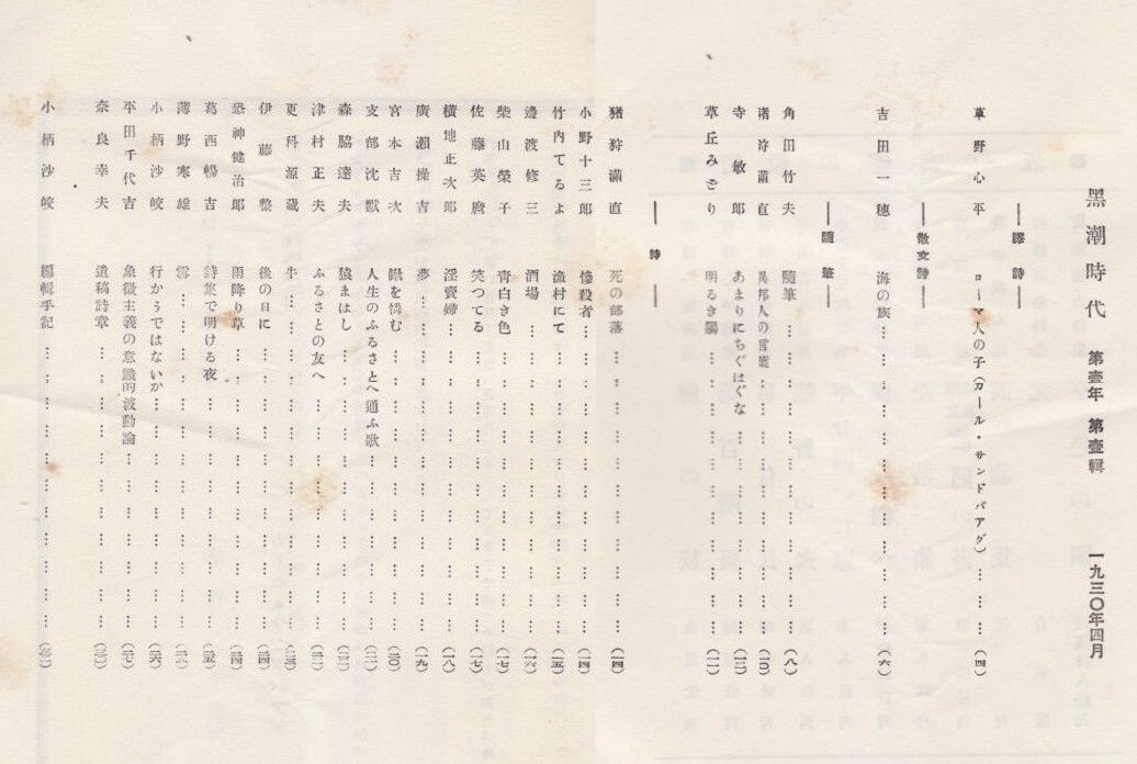 昭和5年4月10日 黒潮時代社発行(夕張) 定価20銭 菊変型判 32頁 編集兼発行人:小柄作雄