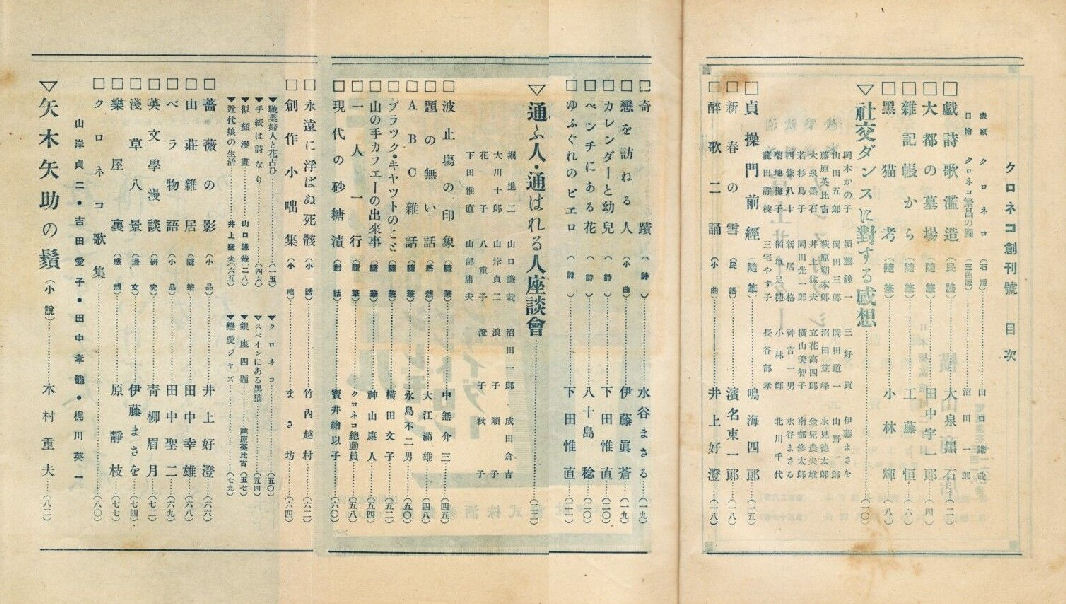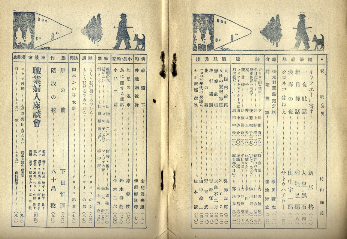 昭和4年2月1日 カフェークロネコ発行 定価20銭 菊判 96頁 編集人兼発行人:下田惟直 表紙(石版):山口謙哉 口絵:沼田一郎