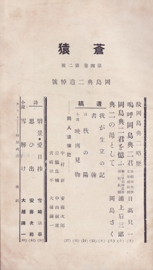 昭和14年3月15日 蒼猿文學社発行 定価30銭 菊判 54頁 編集人兼発行人:大越錬一