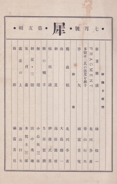 第五輯大正15年7月1日 至言社発行 定価10銭 菊判 18頁 編輯者:福富菁兒 発行者:林信一