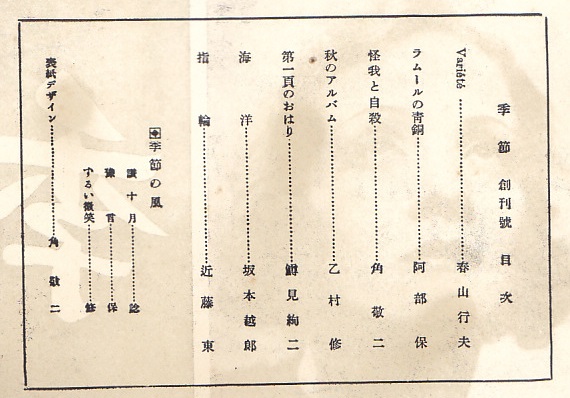 昭和6年12月1日 季節社発行 定価10銭 四六倍判 20頁 編集人:長谷川牧夫 発行人:乙村修 表紙:アポリネール:ピカソ画