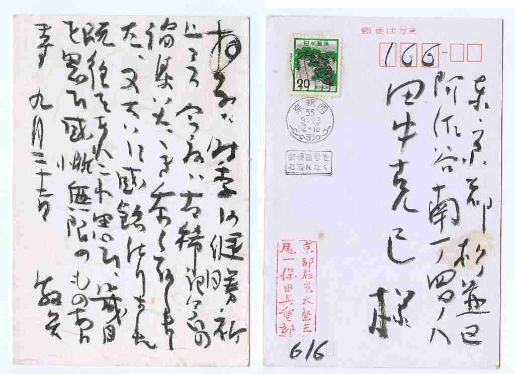 京都西昭和55年9月23日消印、24日着信。 東京都杉並区阿佐谷南一ノ四〇ノ八 田中克己様 京都市右京区太秦三尾一 保田與重郎
