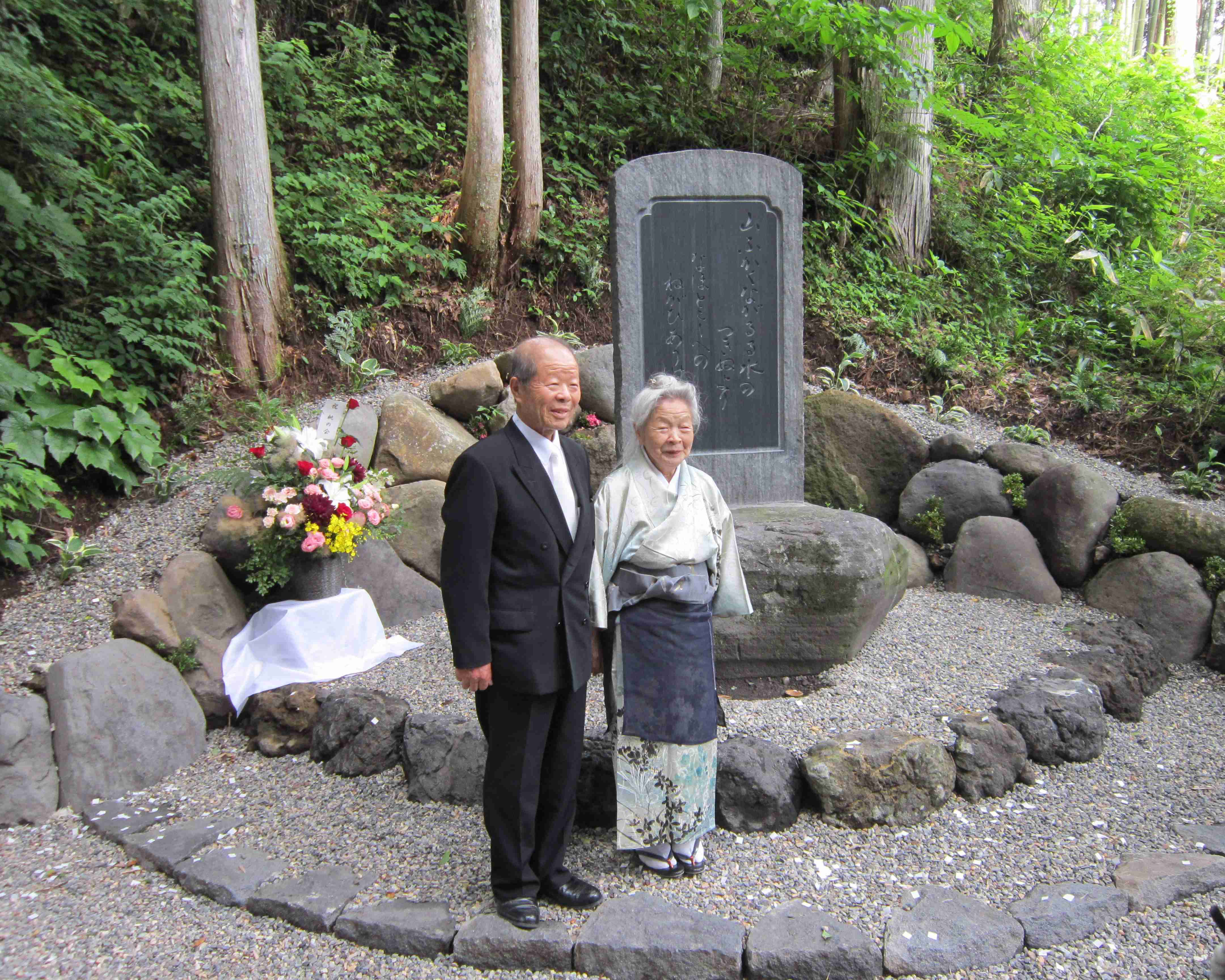 部外者が訪れることも稀なこの谷間には、石碑とは別に、御二人の記念品をおさめた記念館も建てられてゐるが、「タイムカプセル」の未来がどうなるのか、 日本文学そして靖国神社や国体の行末とともに、それは私にもわからない。しかし五百年、千年の後にも、開発とは無縁のこの奥深い美濃の山中に、 一対の歌碑だけは変はらず立ち続けてゐるだらうことは、自然に信ぜられる気がした。けだし前の大戦にしろ遠い過去とはいへまだ100年も経ってゐない。はるけき時の流れについて、 なにやら却って無常の思ひにふけりながら山路の高速道路を帰ってきた。只今の京子様には何卒おすこやかに、健康と御活躍を願ふばかりだが、式典後、 記念館に展示された新婚写真をしげしげと見入る参列者に向かって、「そんなにみつめなさんな」と笑顔で叱るお姿に意を強くしたことである。(2013.6.26掲示板)