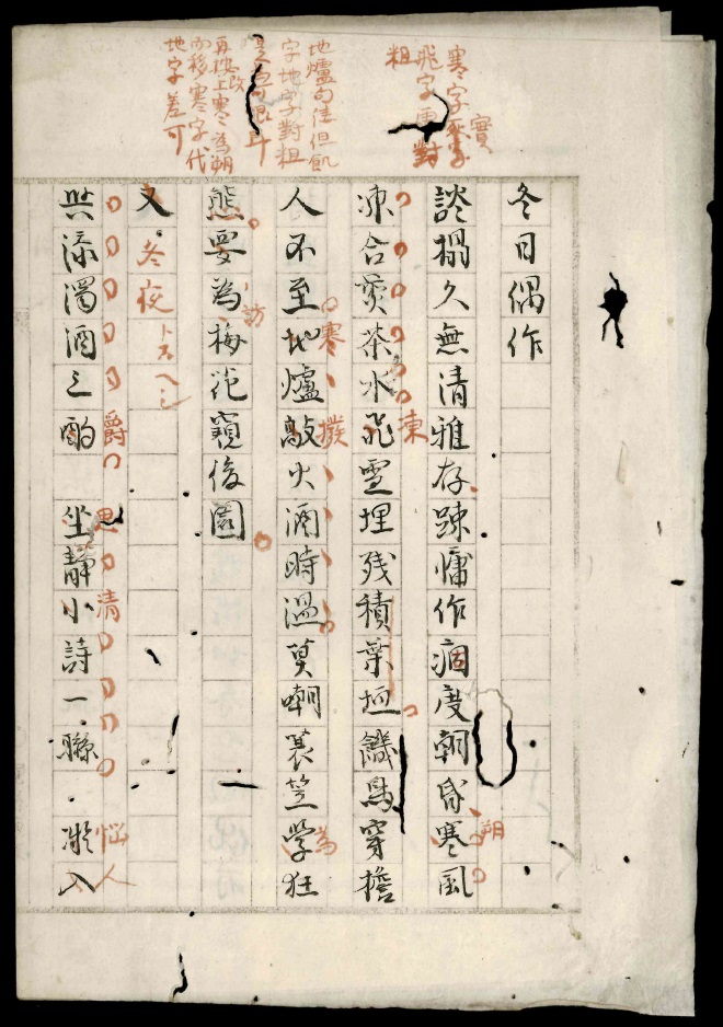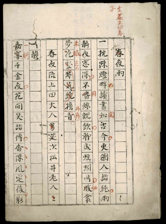 これにより木村寛齋というこれまで知られなかった一詩人の全貌が明らかになるとともに、添削稿においては、当時の詩人間で行われた通信教育の実際を見ることができよう。また郵筒指導の過程でなじみ深い「原稿用紙」の様式が現れるが、その理由についても興味深い事情が知られるのである。