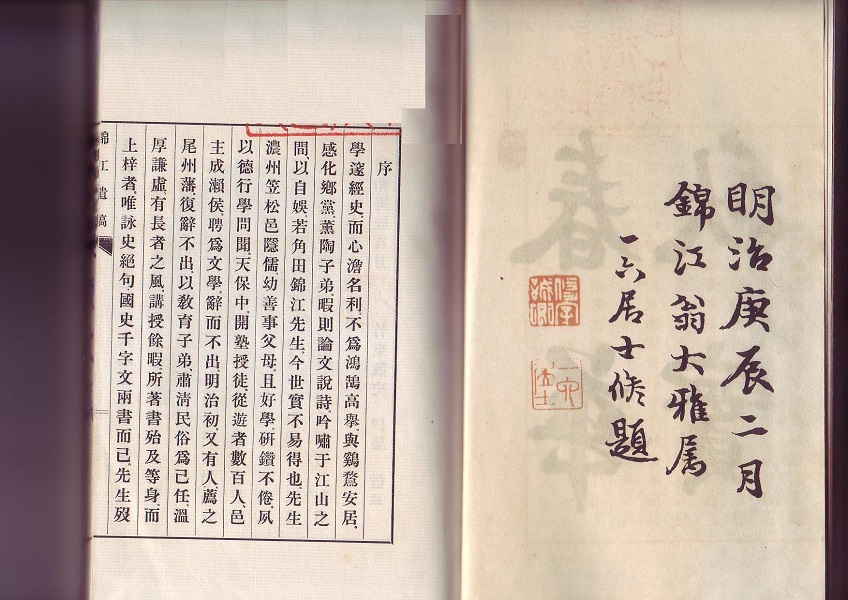 錦江、名を炳。字(あざな)を文虎、春策と称す。錦江はその号、美濃笠松の人なり。父、道立は医を業とし、兼ねるに儒術を以てし子弟を教授す。翁、人となり孝謹、