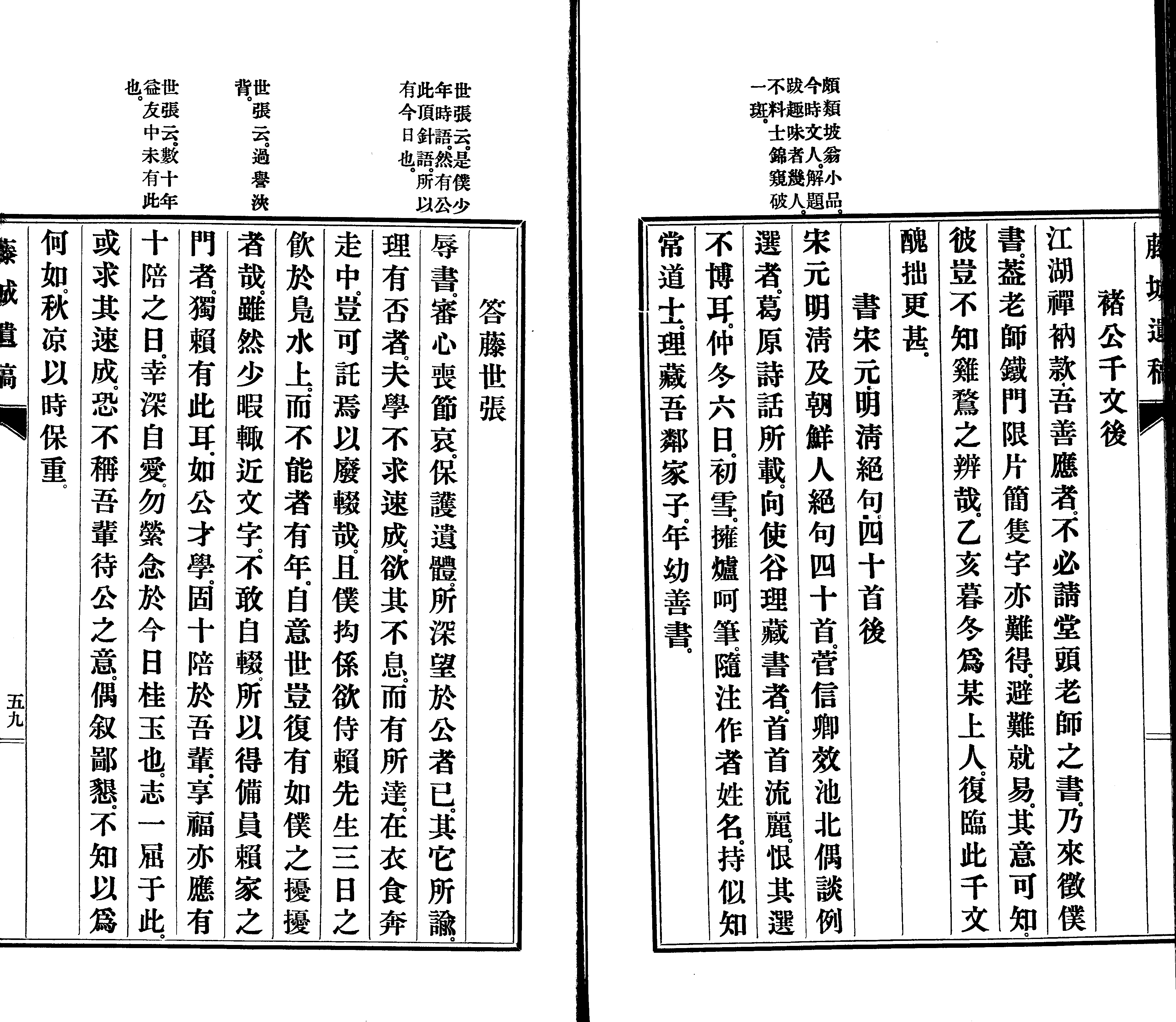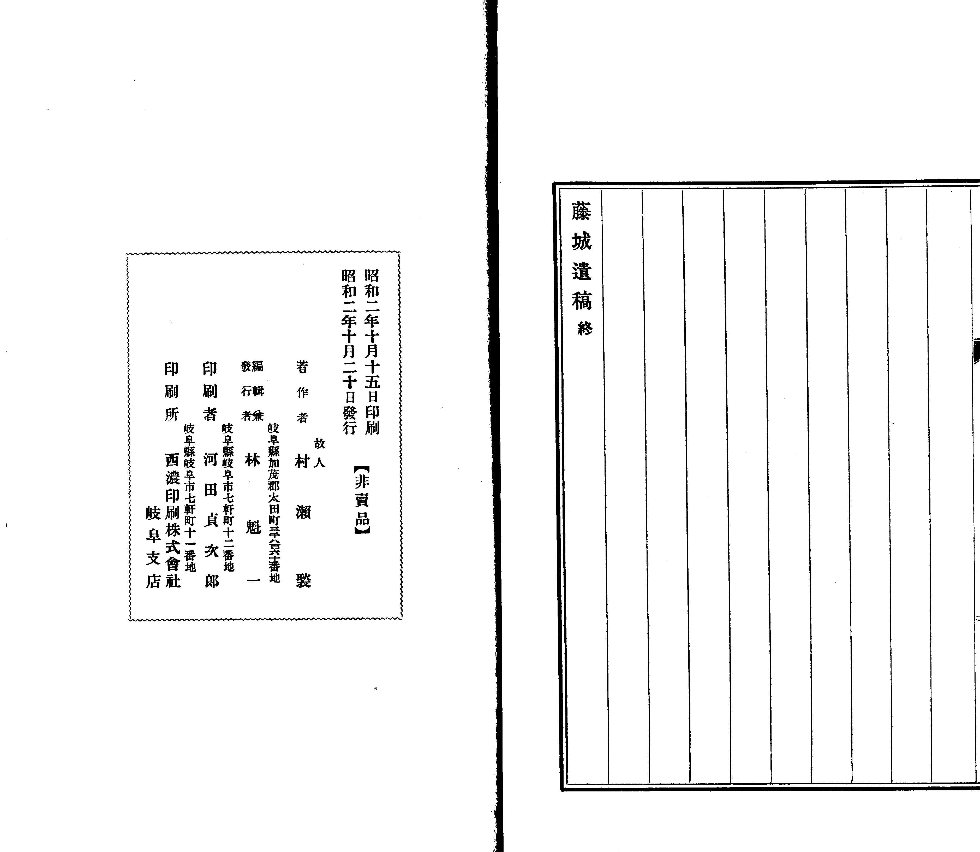 著者生前に刊行計画のあった「藤城詩文集」の残稿に、既刊の「山陽藤城二家対策」の上篇を加へて編輯された。