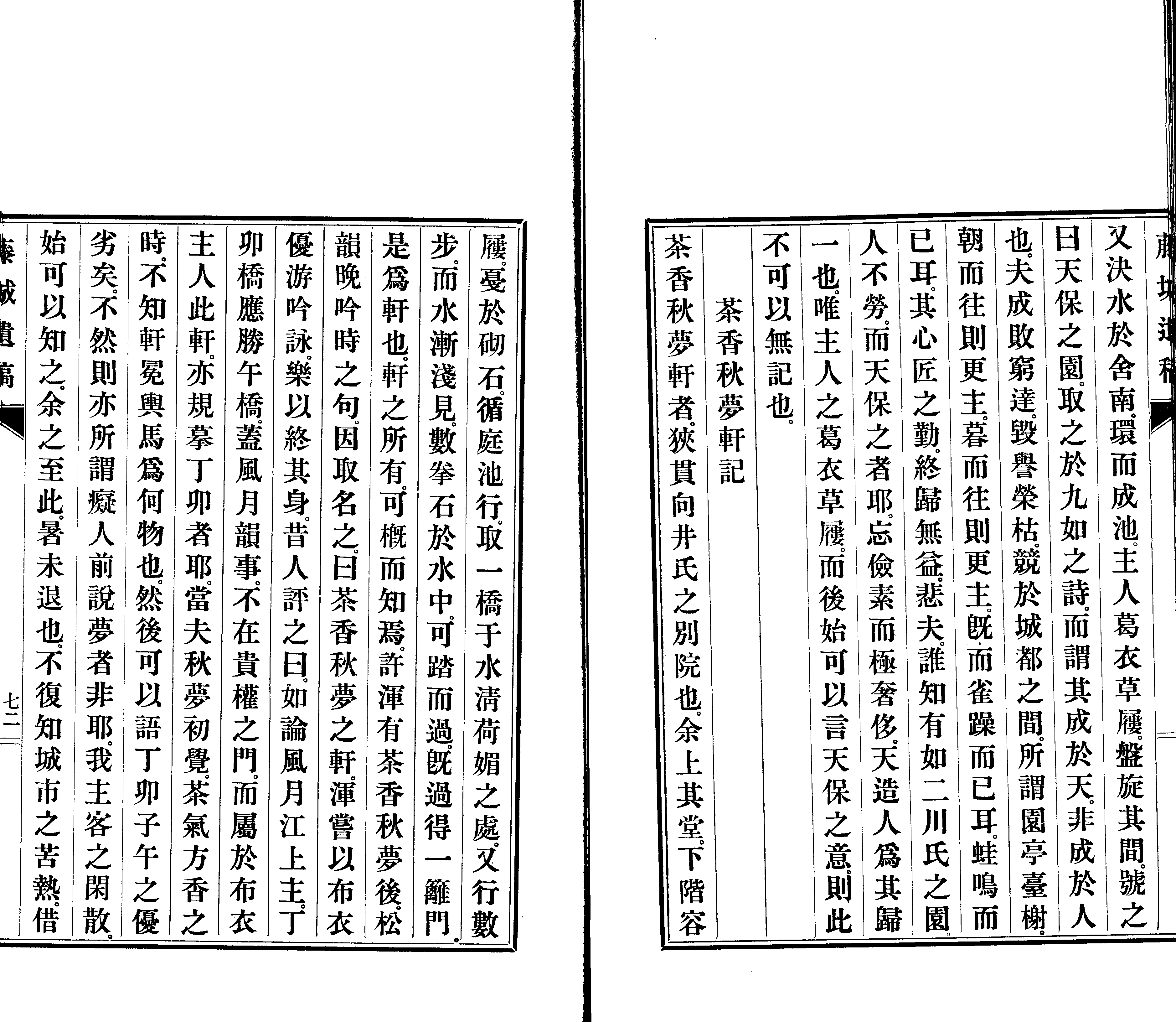 陶詩云。「結廬在人境。而無車馬喧。問君何能爾。心遠地自偏。」梁君伯兎取以名其亭。徴余記之。余以爲地猶跡也。心遠而跡偏者少矣。跡偏而心不遠者或時有。 至於跡不偏心不遠者則比々皆然。今夫士之在都會。以一能一伎聞者。輿迎舟送。食必梁肉衣必軽煖。雖然都會盛衰。朝暮以變。方其盛時戸外客屨累々者。忽而雀躁蝿弔。 移奪於瞬息間。孰獲其心之遠耶。余懐一及之。未嘗不爲之愁然焉。是跡不偏。心不遠者也。如吾伯兎捲身山埜寂寞之間可謂跡偏矣。名不必求聞也。伎不必求售也。可謂心遠矣。 夫心而能遠。淵然以静。浩然以廣。遇喜而喜。遇怒而怒。至於毀誉得喪之觸于中。與夫世變否泰現于前。皆不能眩乱反覆我心。猶何跡之偏不偏是問哉。雖處於四通五達之會。 其心遠者自若也。而况我濃之僻乎。絅生長於濃。嘗苦其僻。湖海飄蕩之想與城郡奔逐之念。常交於胸次。跡已偏矣。而心不能遠。爲可愧也。今得伯兎與相往來。啜茗山窓。 挹酒水檻。論文評詩。不知人世之樂何以換之。深得伯兎避喧遯世所以心遠不待問何能爾也。(庸齋三稿)