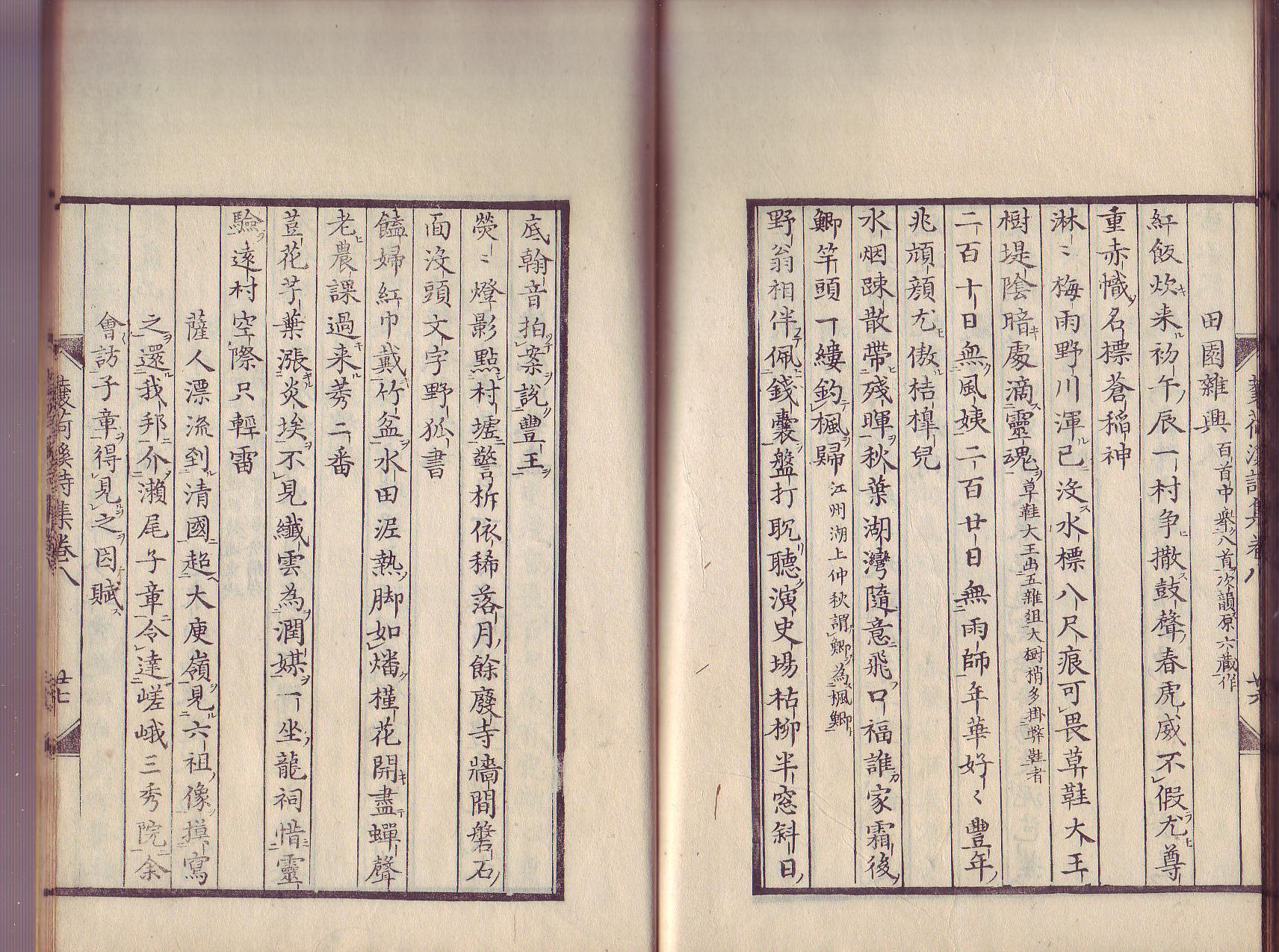 【前略】 (西島)蘭渓の試みなかった田園の新題材を、日本のそれにおいて採用した人に、京都の出で美濃郡上の文学となった杉岡暾桑がある。その『蘘荷溪詩集』(文政七年刊か)によれば、 「田園雑興」を初め、田園に取材するものに富む。「田園雑興百首中挙八首、次韻原六蔵作」などと題する、この方面の多作家である。そしてこの人は、艱題険韻を「坦如平路」くこなし、 「長篇累章多々益奇」(藤原資愛、浅井正胤序)と知人達から評を得ていて、問題の新題材の担当者には恰好であったらしい。石湖や楊誠斎の田園詩中の詩語を採入れた習作らしいものもあるが、 彼の土の農家の風俗に対応して、日本のその間のものを詠じた作品を掲げる。