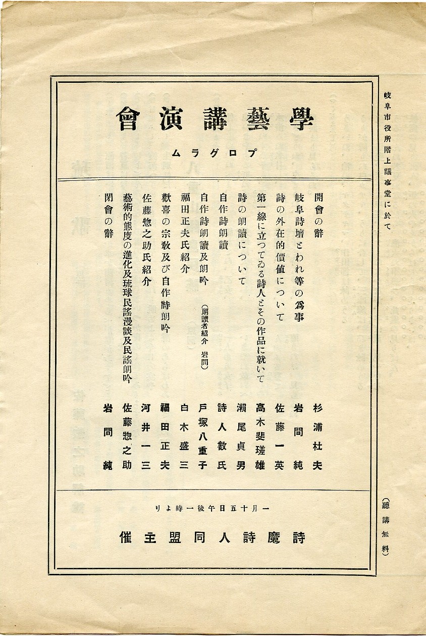 学藝講演會 プログラム (岐阜市役所階上議事堂にて 聴講無料 [昭和三年]一月十五日午後一時より)