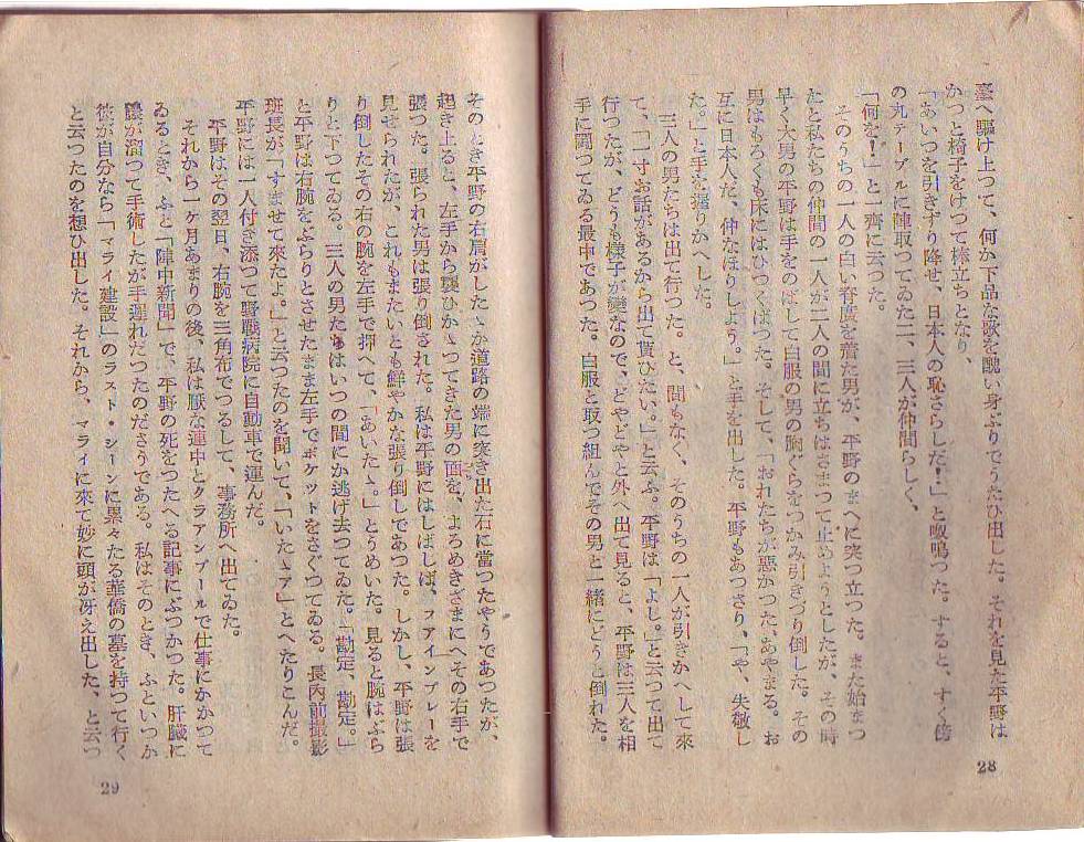 それから一ヶ月あまりの後、私は嫌な連中とクラアンプールで仕事にかかってゐるとき、ふと「陣中新聞」で、平野の死をつたへる記事にぶつかった。