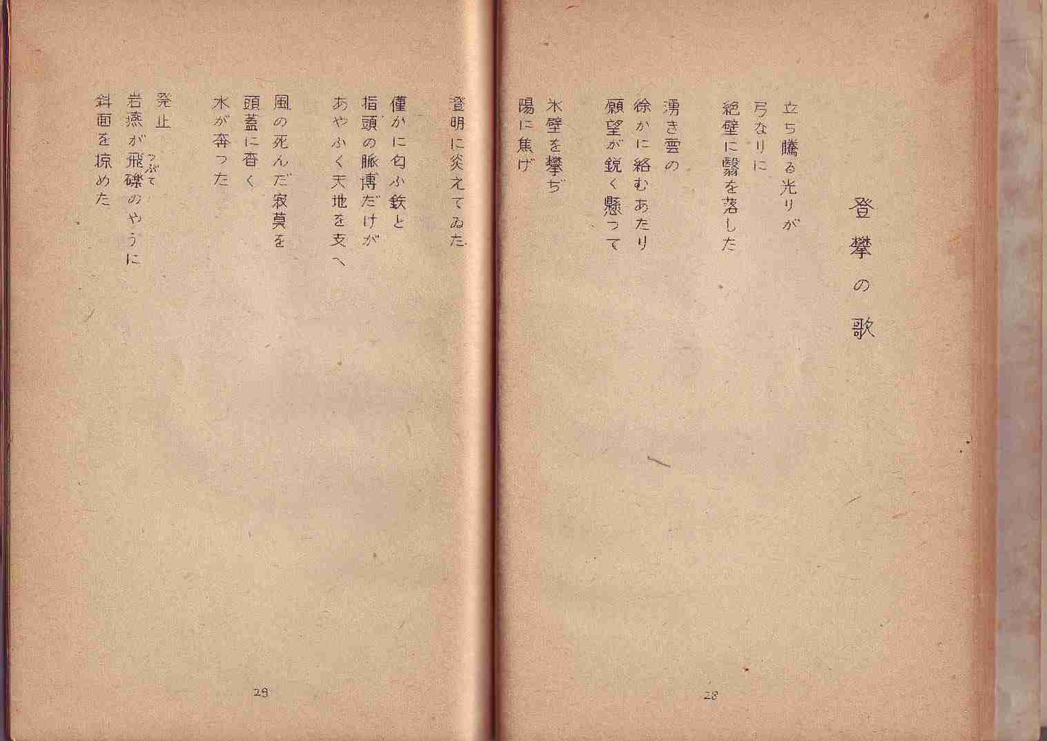 湧き雲に呼びかけ、岩燕を追つて、氷壁を攀る彼の足指、爪は剥れ血さへ滴つてゐるではないか、難行は「出発の朝」から、