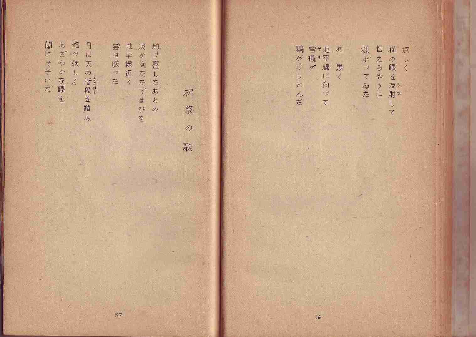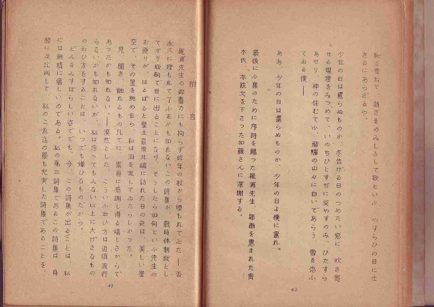 梶浦先生の御盡力にも拘らず昨年の秋から埋もれてゐた――否、永久に埋もれて了ふたかも知れないこの詩集が、戰時体制版としてガリ版刷で世に出ることになり、 そうしたら如何といふ先生のお便りが、はるばる皇土最東北端に訪れた日の夜は、美しい星空で、その星を眺め乍ら、私は泪を流してゐたらしかつた。