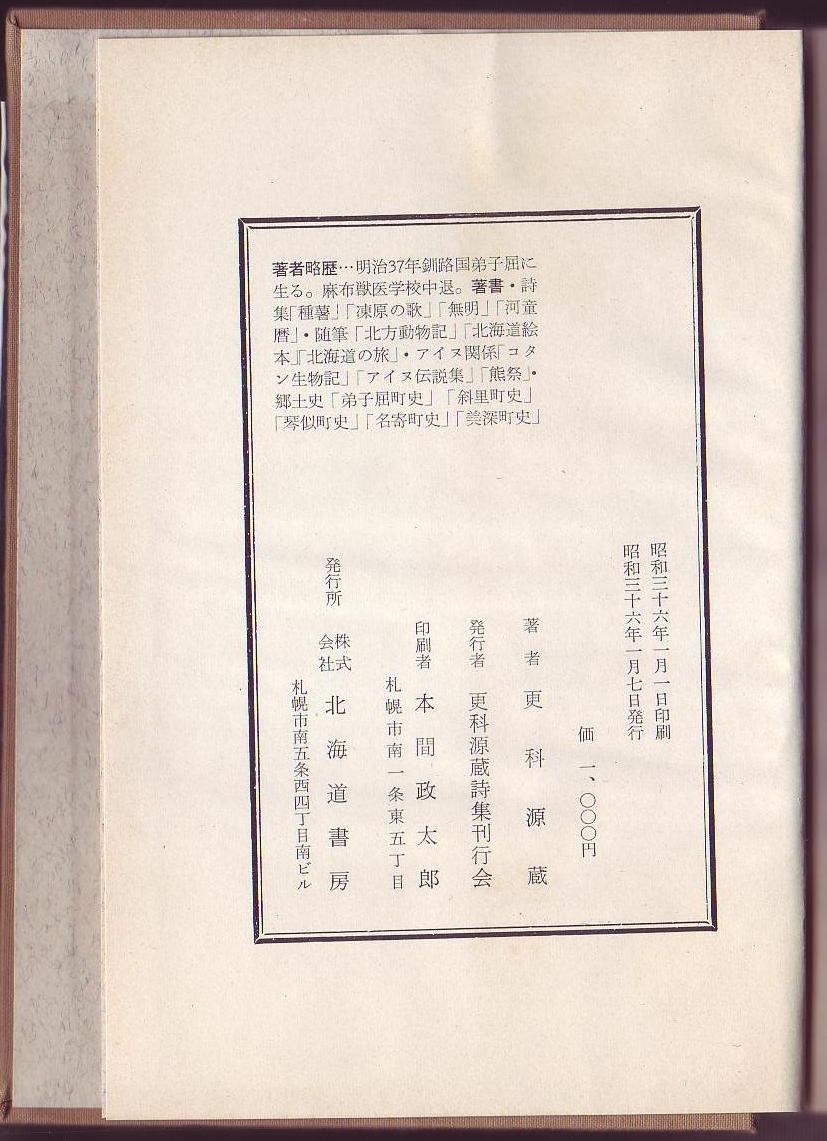 サラシナ ゲンゾウ【更科源藏】『更科源藏詩集』1961/北海道書房/237p/18.8cm上製函/\1000