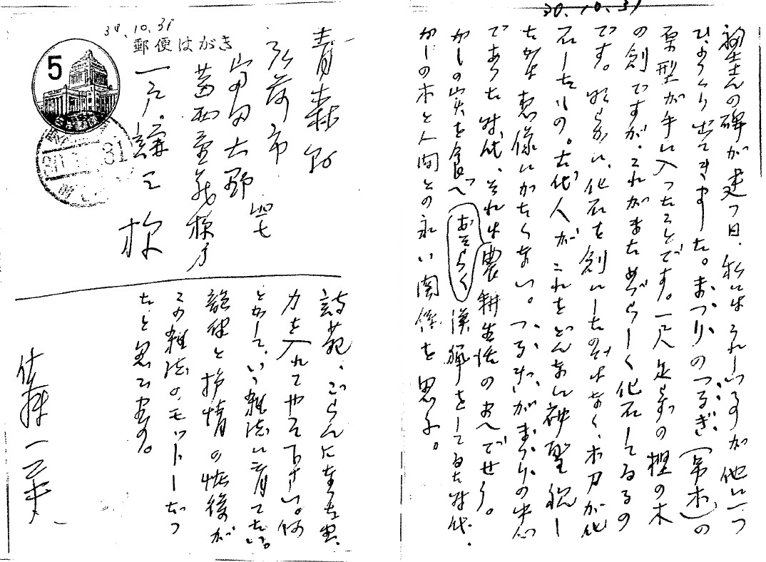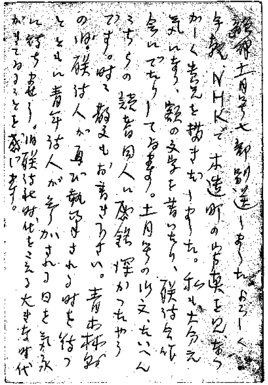 この手紙は十月四日付、毎日新聞日曜版「下北半島」を読んで、どうしても書かなくてはをれなくなって、ペンをとりあげたわけ。こちらも急に寒くなりました。そちらは格別だと思ひます。御起居如何? 私は今年の寒さはよく越せるかどうかと危ぶまれます。いつ死んでもいい覚悟で弟子たちに、あらためて言ひのこすことをつげたりしてゐます。