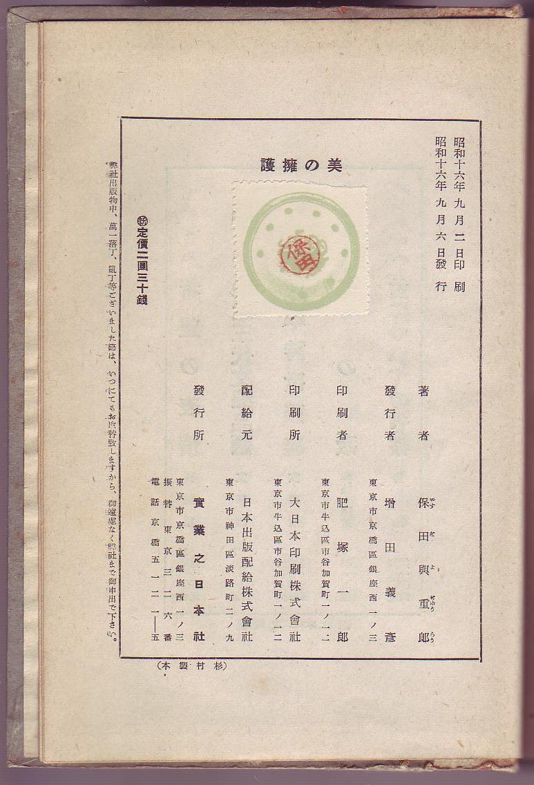 ヤスダ ヨジュウロウ 【保田與重郎】『美の擁護(評論)』1941/實業之日本社/395p/18.5cm上製カバー/\2.00