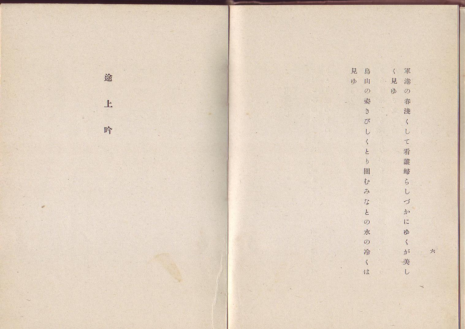 入隊の日、私の最も虞れたのは体重四十キロの痩身である。しかし軍医殿は、ふだんからかうですね、と訊ねただけで身体検査も通過さして下すつた。 八十三歳になる祖母が餞けの日本刀の用意も成り、出船の時を日々待ち焦れてゐる中に、皇軍の戦果はまたたく中に揚り、シンガポールは陥落し、昭南と改称された。この間、 私の心は焦燥するばかりであつたが如何ともなし得ない。焦燥の理由は申すまでもない。戦闘の場を見ずして、何の従軍の詩ぞや、である。
