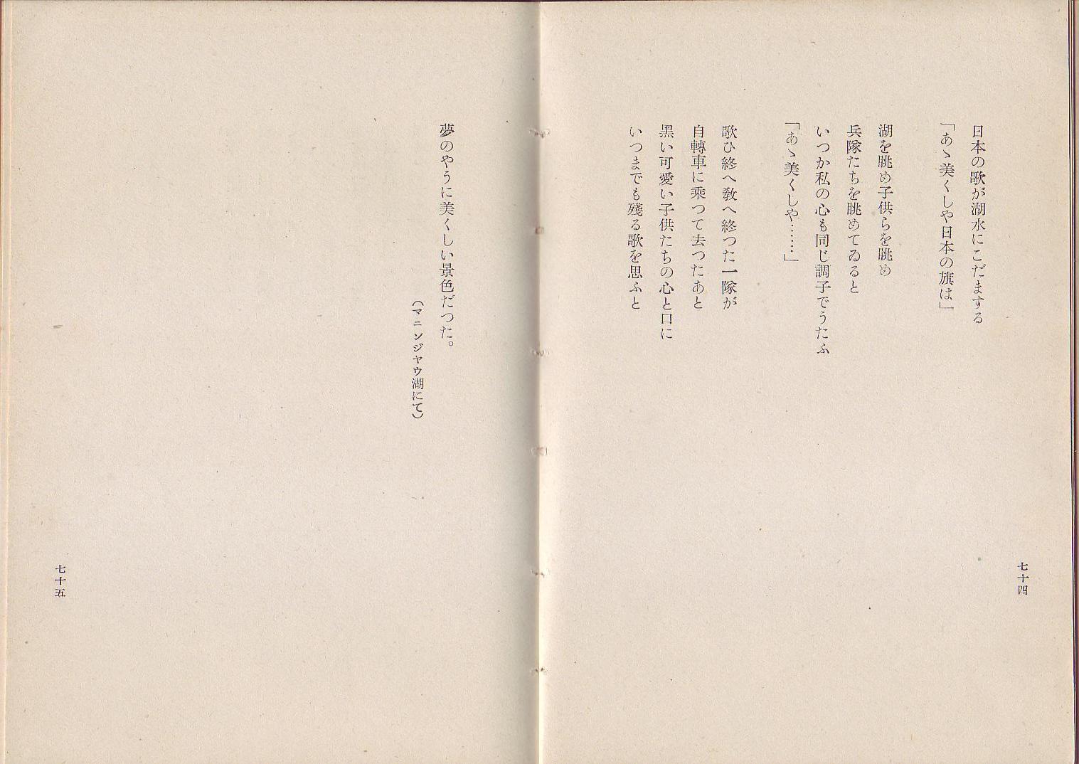 その後のことは詩歌と、巻末に記したその各々の解説とを見ていただけば宜い。ただ附加へねばならないことは、私が残念がった詩人が実戦の揚に臨み得ないなどといふことは、 それこそ大変な考へ違ひであって、大御稜威の発揚が拙き詩を待たずとも自ら明らかなことは疑ふべくもない。詩人の持参の筆のみか、日本刀の無用であつたことも、 残念がつて佐々木六郎上等兵に嗤はれた。詩人が刀を揮ふときは我軍に一兵をも残さずなつた時のみ。その刀を揮ふ時を望むは敵の優勢を望むに等しい、といふのが嗤ひを訝かつた私への答であつた。