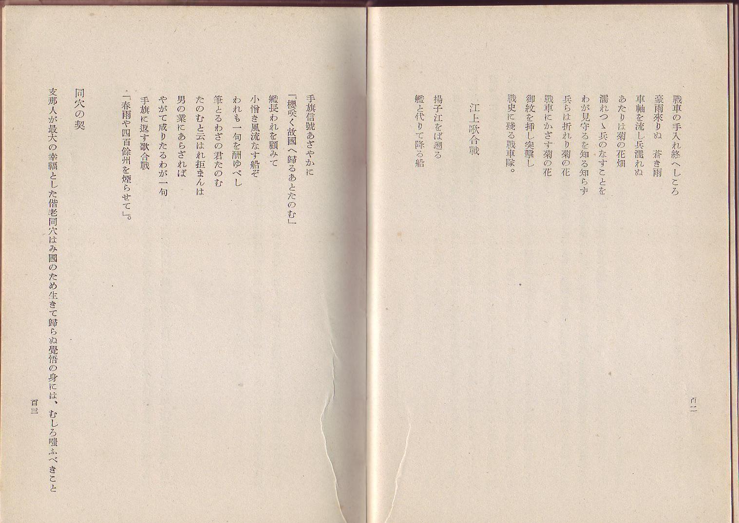 自分は咄嗟に諒解した。大戦果に感激し、兵隊達を慰労しようと、街角の支那人の舗から逢けくも詩人が購ひ来つたのだと、幾度かこの歌を誦し、 孤影仄暗い階段を降りて行つた詩人の跫音を聴く思ひで自分等は杯を傾けたのである。