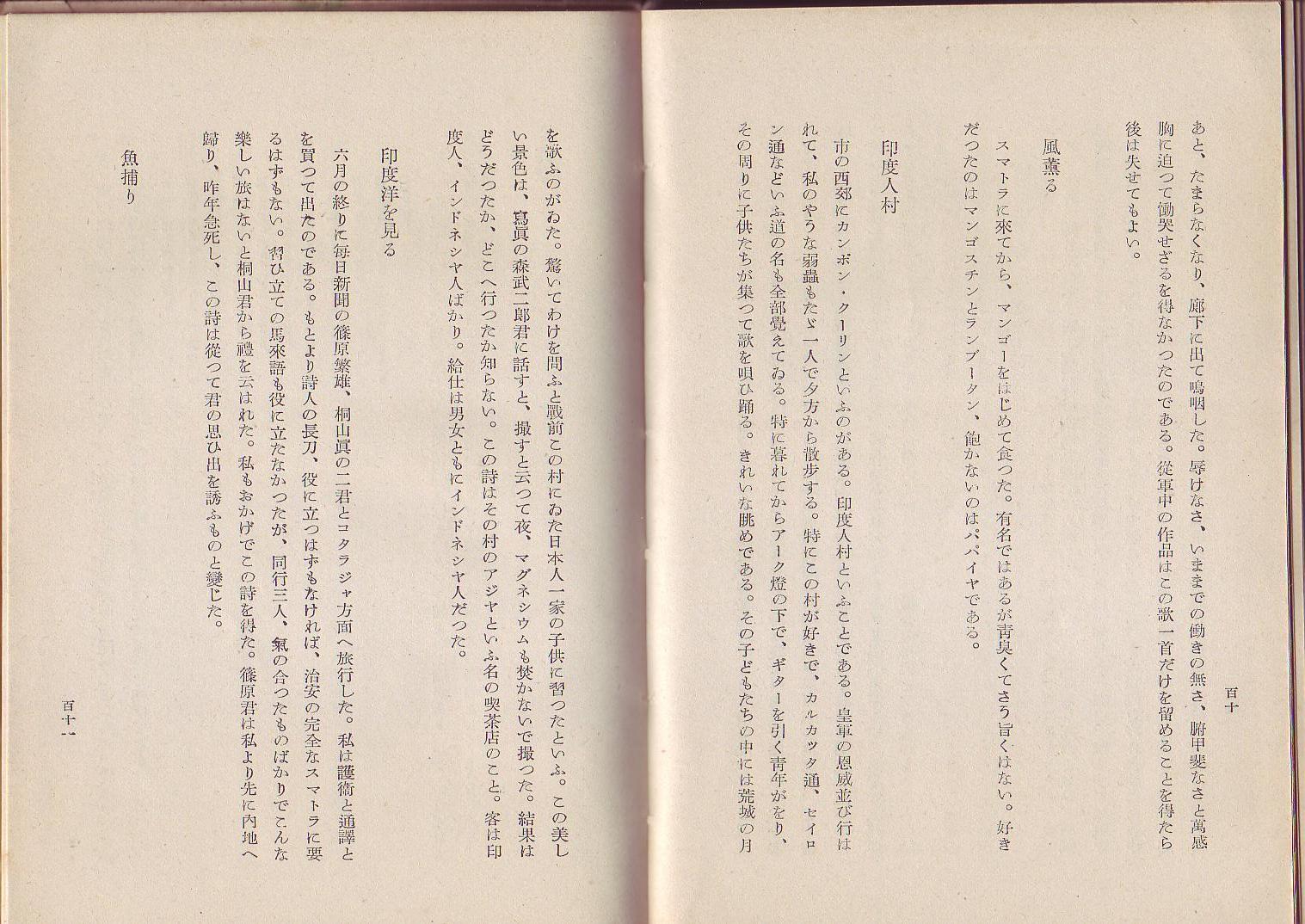 六月の終りに毎日新聞の篠原繁雄、桐山眞の二君とコタラジャ方面へ旅行した。私は護衛と通訳とを買つて出たのである。もとより詩人の長刀、役に立つはずもなければ、 治安の完全なスマトラに要るはずもない。習ひ立ての馬来語も役に立たなかつたが、同行三人、気の合つたものばかりでこんな楽しい旅はないと桐山君から礼を云はれた。 私もおかげでこの詩を得た。篠原君は私より先に内地へ帰り、昨年急死し、このしは従って君の思ひ出を誘ふものと変じた。