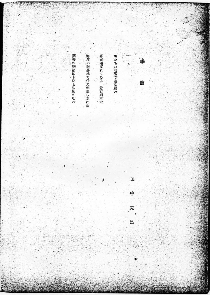タ陽はわたしの上衣を輝かす わたしは釦をはづす 白い襯衣(シャツ)に夕陽をあてようと わたしの胸は直ぐ出血しだす わたしはそれゆゑ静かに釦をかける もつと静かに血は流れつづける 蜩(かなかな) わたしは口からも血を喀く