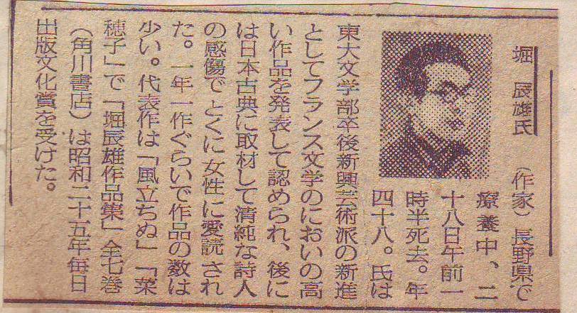「けふ会社へ堀辰雄夫人より電報。夕刊にものりをり。辰雄氏1:30死去、48才と。alas!」
